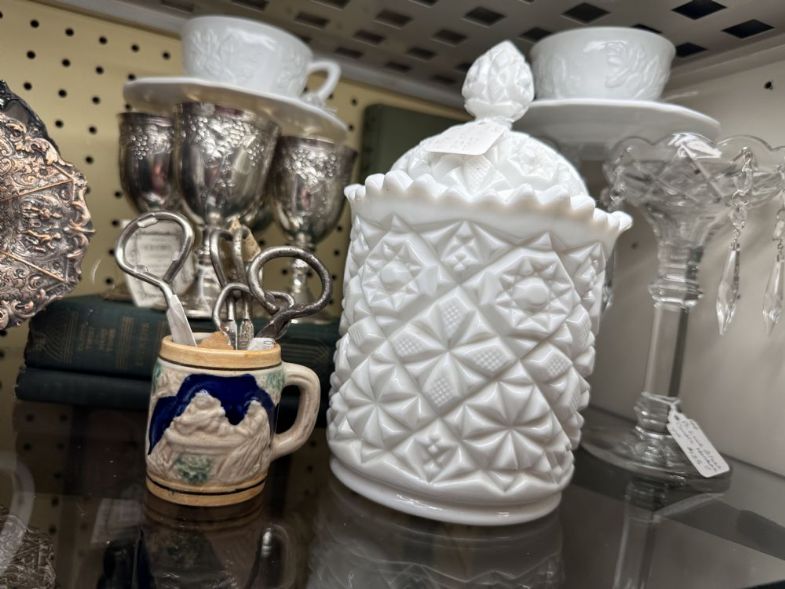 Showcase - Vintage books, milk glass, silver