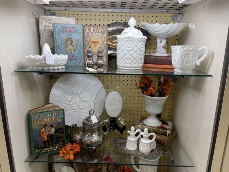 Showcase - Vintage books, milk glass, silver